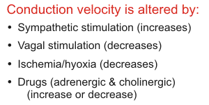 The conduction of electrical impulses in the heart occurs cell-to-cell and highly depends on the rate of cell depolarization in both nodal and non-nodal cells. Therefore, because conduction velocity depends on the rate of depolarization, autonomic nerve activity, hormones, drugs and electrical changes in response to ischemia can alter the rate of depolarization and affect conduction velocity. Sympathetic activation increases conduction velocity in the AV node and in the His-Purkinje system by increasing the rate of depolarization (increasing slope of phase 0) of the action potentials. This leads to more rapid depolarization of adjacent cells, and more rapid conduction of action potentials (positive dromotropy). Sympathetic activation of the AV node reduces the normal delay of conduction through the AV node, reducing the time between atrial and ventricular contraction. The increase in AV nodal conduction velocity can be observed as a decrease in the PR interval of the electrocardiogram. Sympathetic stimulation of His-Purkinje pathways speeds up ventricular depolarization. Sympathetic nerves exert their actions on the AV node and His-Purkinje fibers by releasing the neurotransmitter norepinephrine that binds to beta-adrenoceptors, leading to an increase in intracellular cAMP. Therefore, drugs that block beta-adrenoceptors (beta-blockers) decrease conduction velocity.